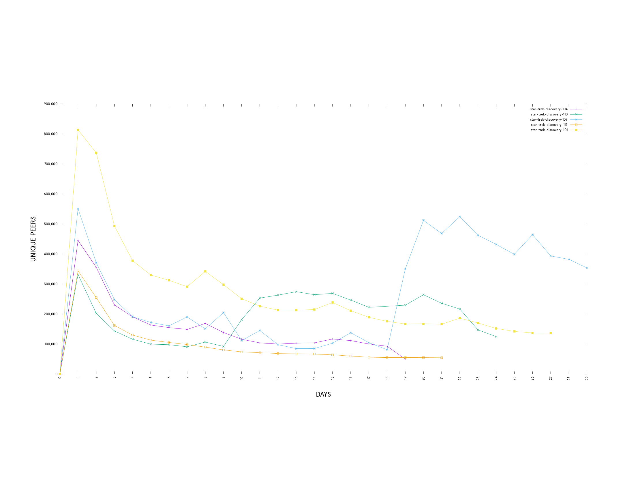 For the following episodes: 101, 104, 109, 110, 115, the trend is down: from first to last episode, peak peers is down over 50%. Episode 109/110 start to show some life after these episodes are enabled in specific Asian markets (Japan, China, ASEAN or other was delayed). This coincides with the beginning of the second Michelle Yeoh plot arc. This bump did not last through the last episode.